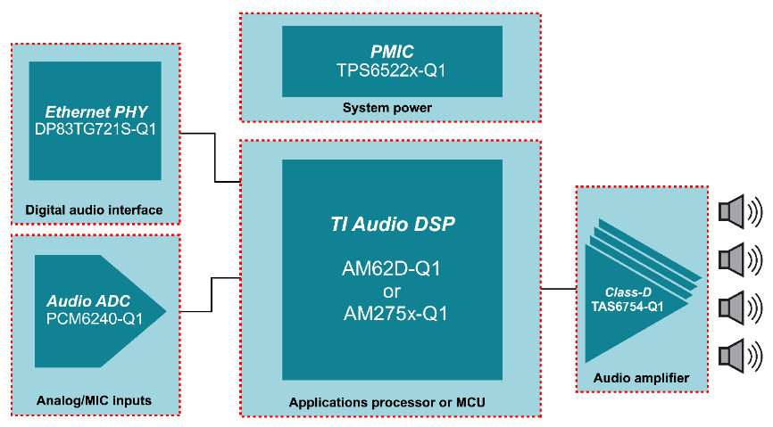 过去=□▪★,高端汽车音响系统中的数字放大器采用分布式架构进行音频处理▼◇□,由单独的 MCU◁=□▷◆◁、数字信号处理器 (DSP) 和网络集成电路 (IC) 处理不同的任务○▷★-。虽然这种分立式方法通常提供了设计灵活性★◆▷-●◆,但也增加了系统复杂性▽●、成本和尺寸□○☆。为了增加沉浸式环绕声和道路噪声消除 (RNC) 以提供家庭影院般的体验●◇•▽=,同时优化燃油和能源效率•☆•□▽◆,需要增加元件▽•、音频通道和软件类型的数量◆-▽。图 1 展示了现代车辆中的音响系统示例□◇★,其中包含用于环绕声的多个扬声器和用于 RNC 的麦克风○◁▼▲▽。